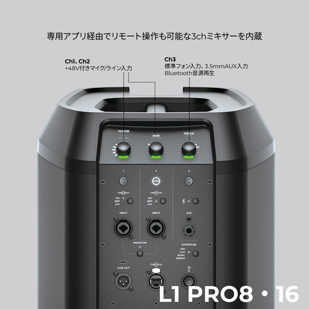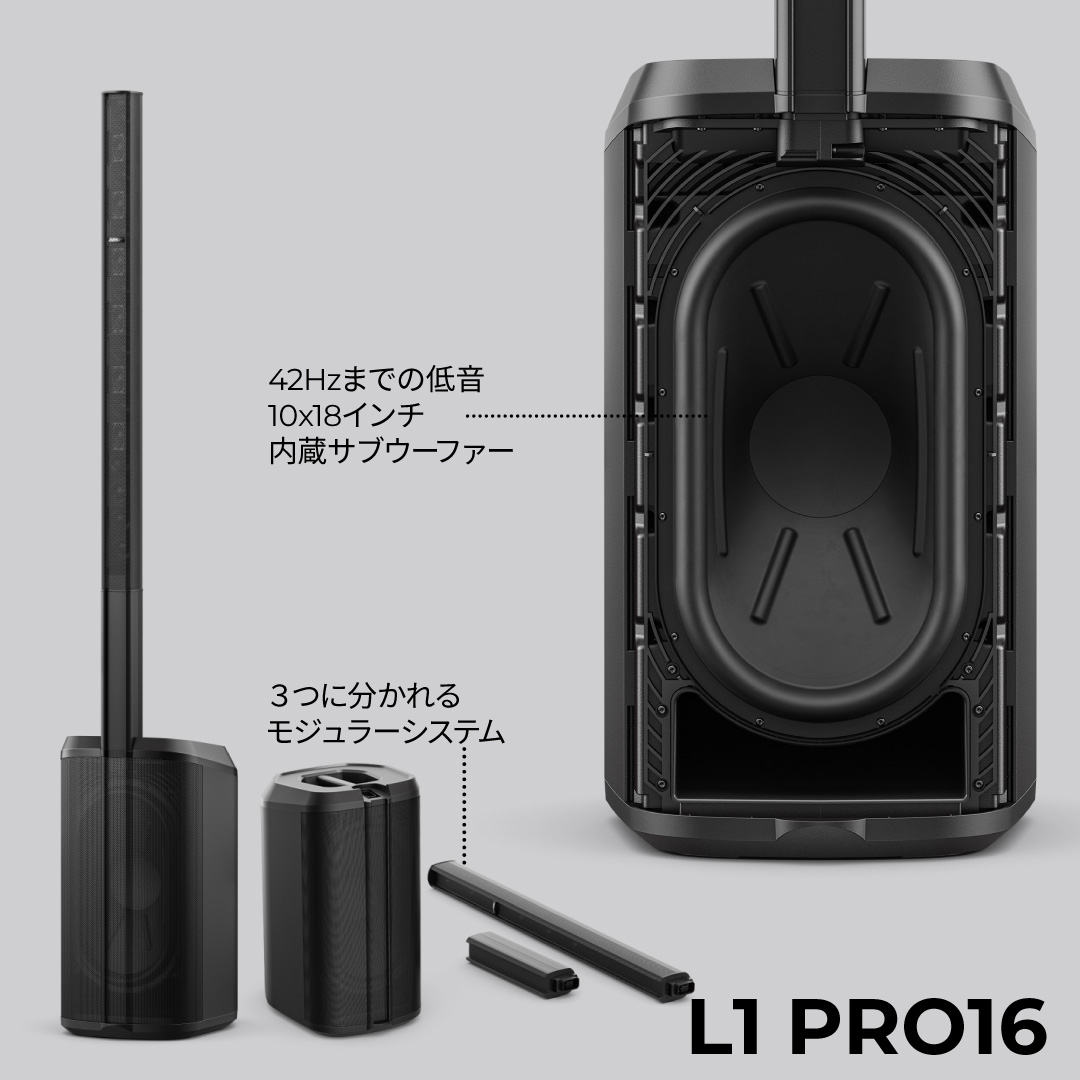 L1 Pro16は、高出力とパワフルな低音域の再生を可搬性に優れたサイズで実現したバランスのとれたシステムです。16個の2インチネオジムドライバーによるJ字型アーティキュレーテッドラインアレイにより柔軟な垂直カバレッジを提供します。シンガーソングライター、DJ、小規模のアンサンブルによるクラブやバーなどの小中規模の会場でのパフォーマンスに最適です。