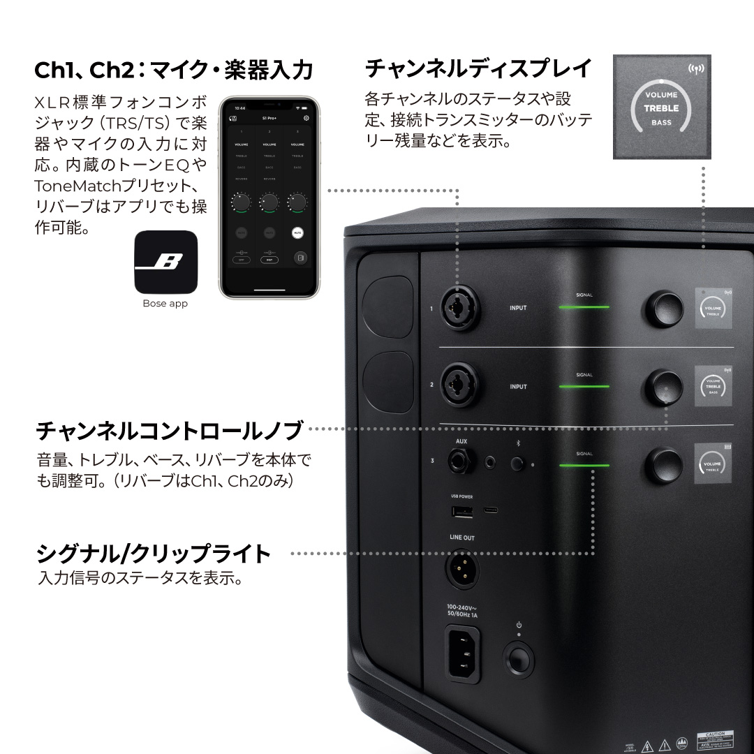 S1 Pro+は、あらゆる場所でいつでも最高の音質を提供するオールインワンPAシステムです。マイクや楽器をワイヤレス接続できる専用トランスミッター、モバイルアプリによるワイヤレスコントロール、さらにバッテリー駆動対応と軽量なボディーにより高い実用性と究極のポータビリティを実現しています。S1 Pro+は、自宅で街でイベント会場で圧倒的な利便性とパフォーマンスを発揮します。