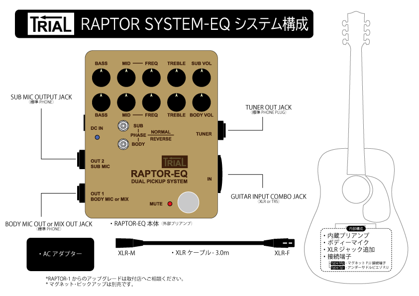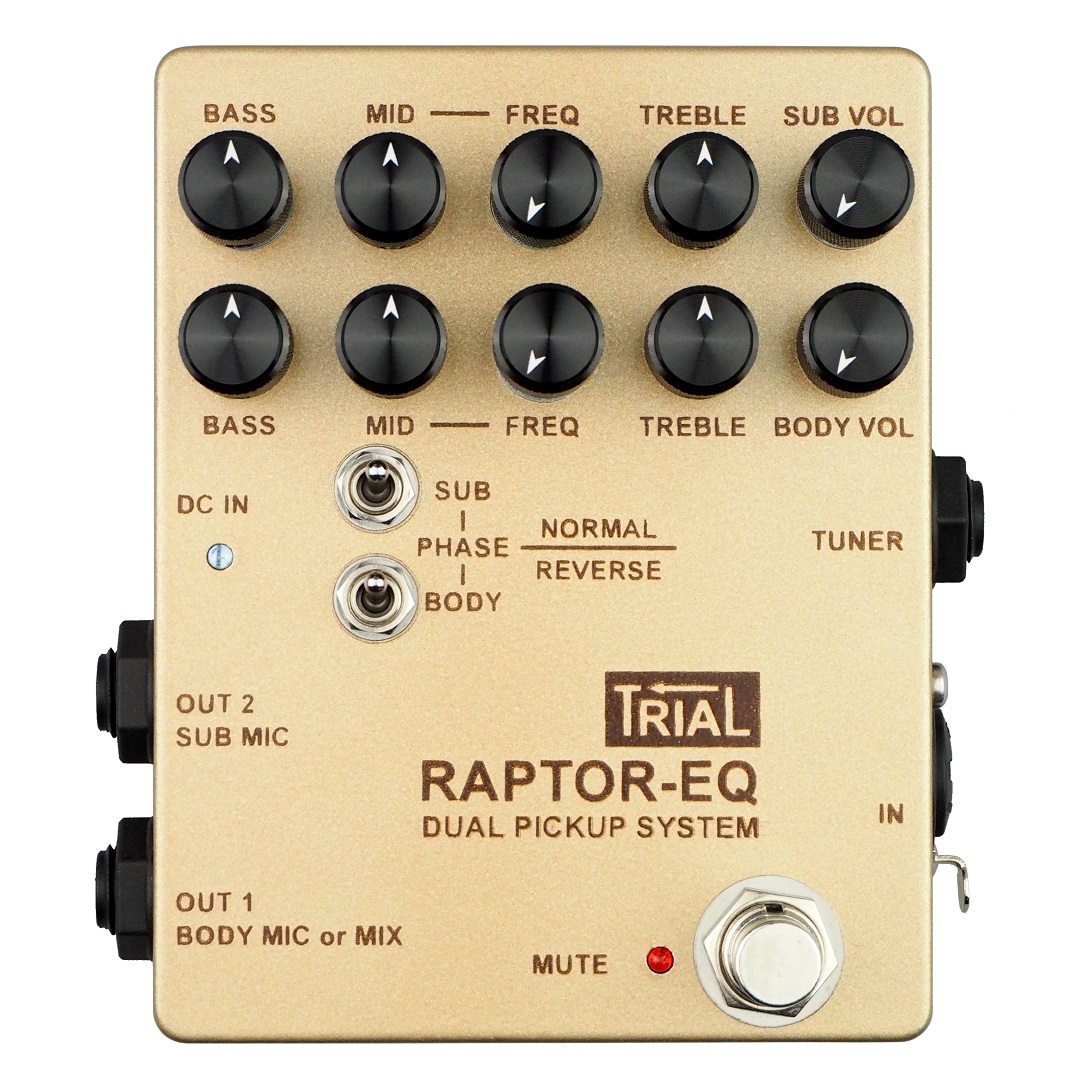 外部プリアンプRAPTOR-2にイコライザーを搭載した、デュアルピックアップシステムです。SYSTEM-2同様、入力端子にコンボジャックを採用、XLR、TRSの入力が可能になりました。