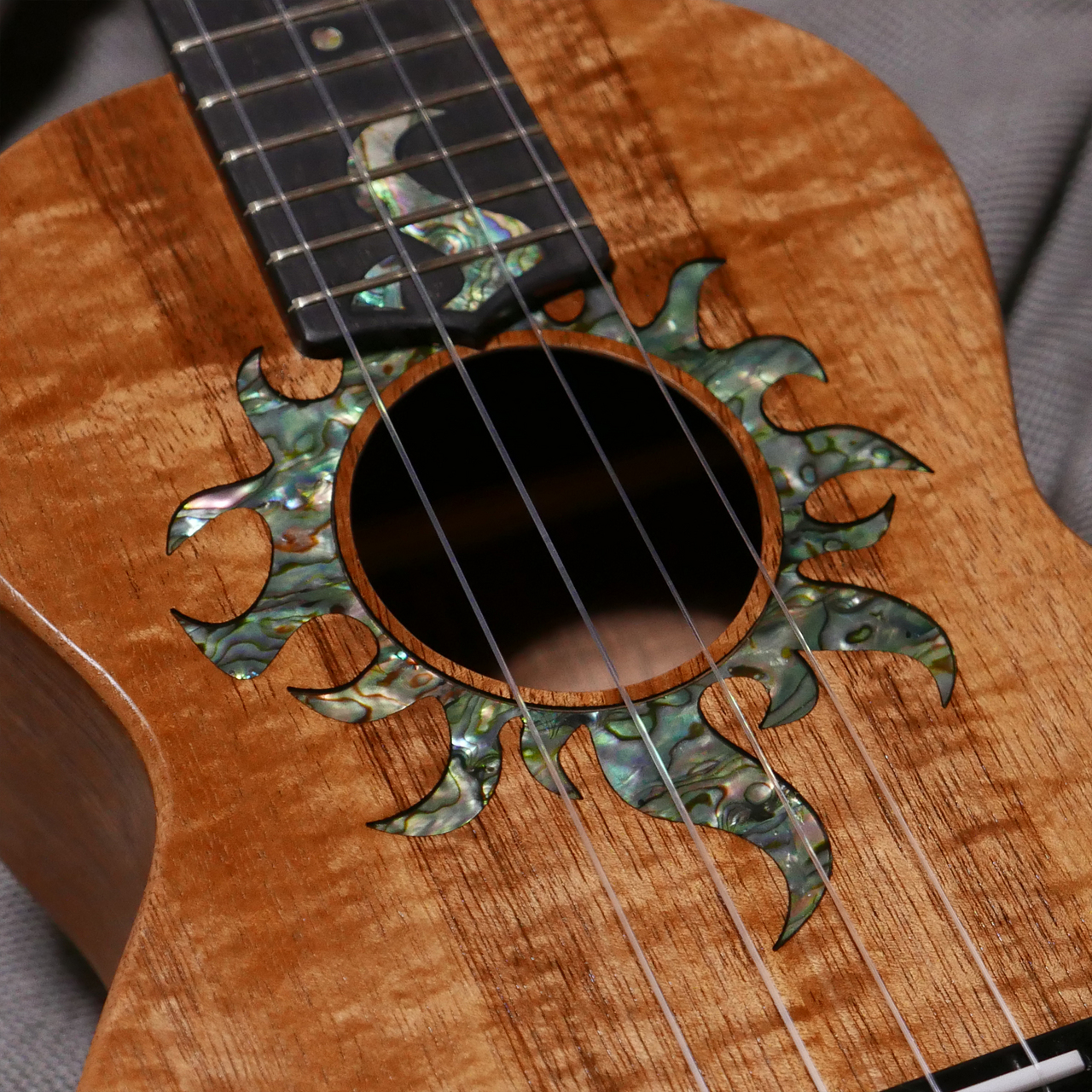 サウンドホールの周りにアバロンで美しい太陽のインレイが施されたテナーウクレレ。