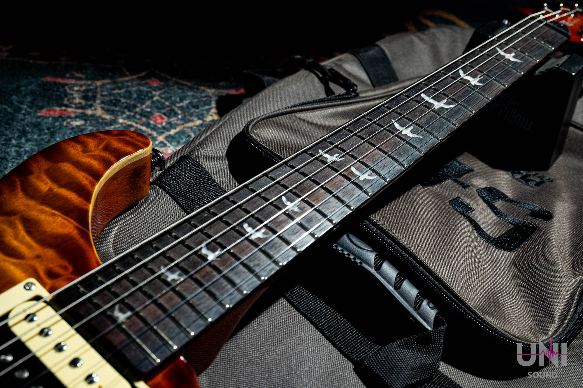 当時のSE Custom 24はフレイムメイプルトップが基本ですが、本機は記念仕様としてキルトメイプルを採用。